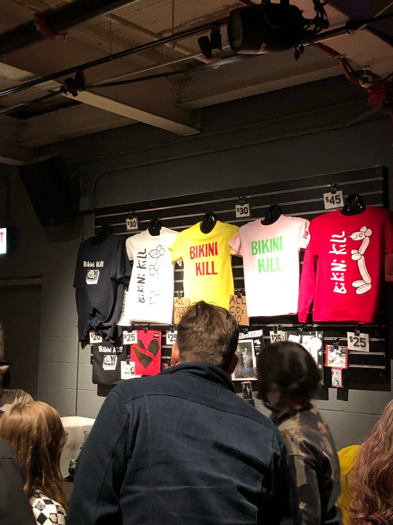 At times being there felt performative. Was I there for the history? To honor it? Or to see history move around a room and entertain it? To just? be there? Would it feel that way if I knew the band? Would it feel that way if it wasn’t a landmark feminist punk band? Would it feel that way if it was a band made up of all men? That I didn’t know? Something about gender goes here. I’m not sure what it is. Does it go against my feminism to say that remarking about an all women band does the a disservice? Shouldn’t we love them no matter their gender? Isn’t the point of gender equity not having to mention that Bikini Kill is a band that happens to contain all women? Because that’s the point of their existence? Or is ignoring that going against the point of Bikini Kill? Or are we all here because Bikini Kill did it first? (Oy. The Raincoats did it first. And I’m pretty sure Hannah knows that too. This woman knows her shit.) What’s going on here? The feminist lens has smeared my view!