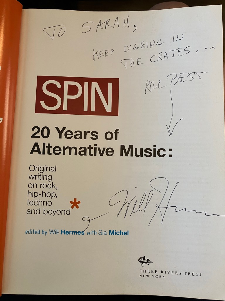 Hermes’ 2011 book Love Goes To Buildings On Fire: Five Years in New York That Changed Music Forever is one of my all-time favorite books. I recommend it to people of all stripes (music fans, punks, NYC history fans, and all those cross-combos you can imagine). I read it right after devouring Patti Smith’s Just Kids, published the year before in 2010. I then checked Hermes’ index and bought old, used books online he had sourced to tell his story; they are some of my favorites in my music book library. I brought Love Goes… for him to sign, along with a SPIN anthology he co-edited, published in 2005, I’ve had since high school. He was shocked to see the anthology; I treasure it still (it was what finally got me, a late bloomer, always, to pay attention to Pinkerton and Smashing Pumpkins in my early 20s).